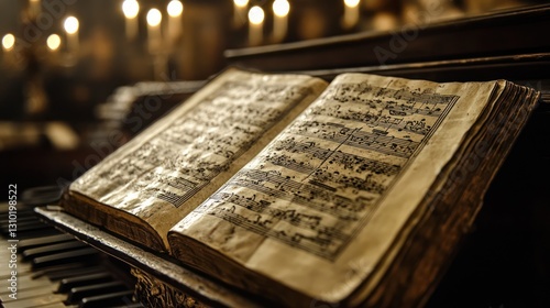 Antique music book on vintage piano with candlelight.
