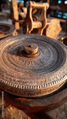 antique, spinning, wheel, machine, industrial, metal, ornate, design, craftsmanship, vintage, machinery, tool, gear, circular, engraved, decorative, textured, patina, aged, historical, relic, manufacturing, detail, precision, mechanism, equipment, work, industry, technology, intricate, artistry, delicate, pattern, metalwork, artisan, art, process, factory, production
