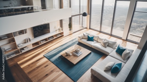 top, furnished, pillow, view, interior, living, modern, drawing, sideboard, room, shelf, sofa, plan, angle, chair, lamp, three-dimensional, contemporary, rug, flat, apartment, house, design, indoor, floor, table, wall, home, white, wood, couch, seat, wooden, brown, hardwood, beige, cushion, yellow, carpet, window, lounge, hot drink, architecture, bookshelf