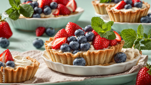 Appetizing tartlets with cream, strawberries, blueberries, mint