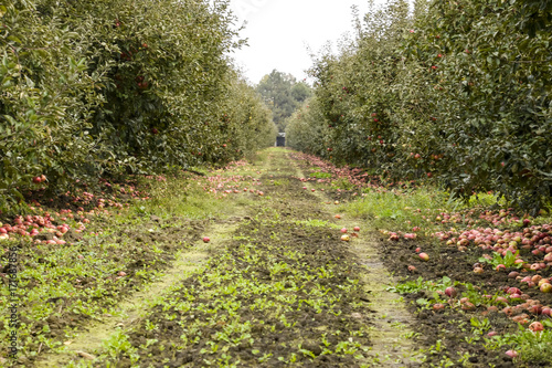 Apple orchard. Rows of trees and the fruit of the ground under t