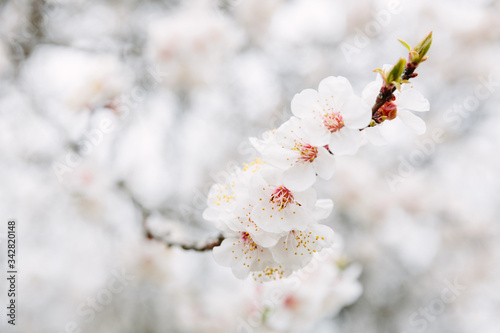 Apricot tree branch with flowers, beautiful seasonal floral nature background. Early spring blossom. Freshness and tenderness concept. April day beauty.