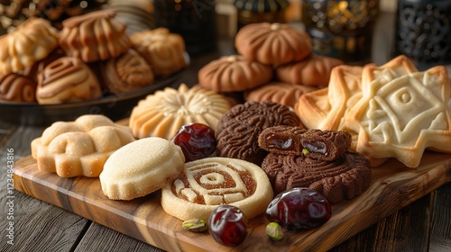 Arab sweets. Traditional eid semolina maamoul or mamoul cookies with dates and pistachio nuts HD 8K wallpaper Photographic Image