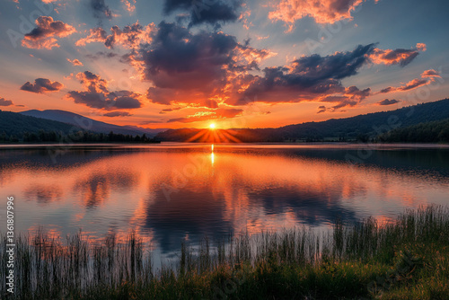 sunset, lake, water, sky, landscape, sunrise, nature, sun, cloud, river, cloud, blue, evening, beautiful, summer, dusk, orange, morning, tree, red, calm, peaceful, dawn, duck pond