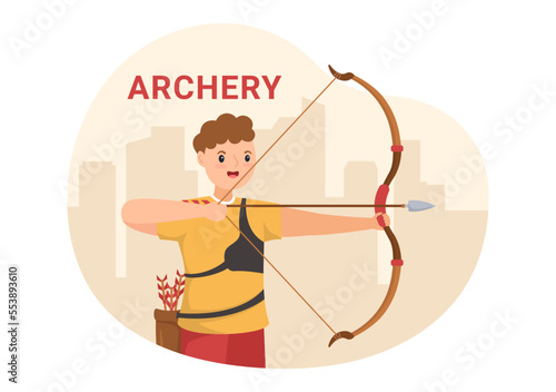 Archery Sport with Bow and Arrow Pointing at Target for Outdoor Recreational Activity in Flat Cartoon Hand Drawn Template Illustration
