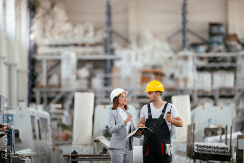 Architect and worker working on project. Colleagues discussing work in factory.