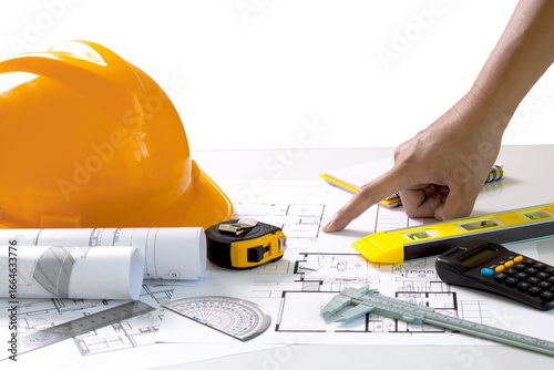 Architects concept, project house, Construction plans with yellow helmet and drawing tools on blueprints, of engineering tools on work table,