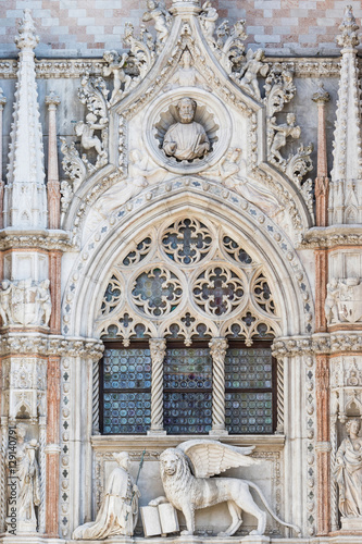 Architectural detail of Basilica of Saint Mark (Venice, Italy). Vertically. Closeup view of sculpture of Doge and Venetian lion.