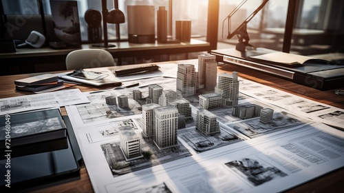Architectural drawings and plans laid out on the table and in rolls. Building models.