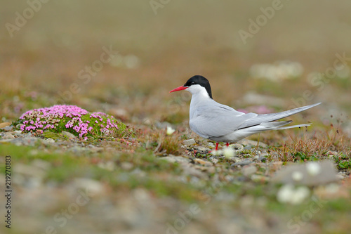 Arctic Tern, Sterna paradisaea, white bird with black cap, with Arctic landscape in background, Svalbard, Norway. Wildlife scene with bird from Svalbard. Pink flowers with bird.