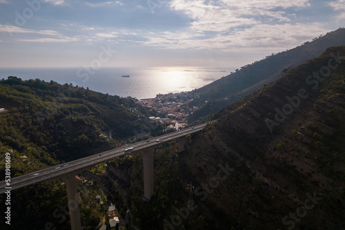 areal view of highway on bridge and mountain area