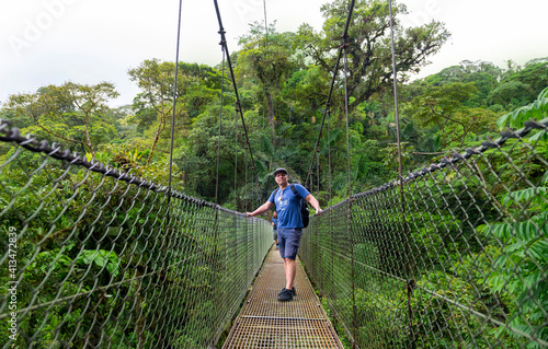 Arenal Hanging Bridges, man hiking in green tropical jungle, Costa Rica, Central America.