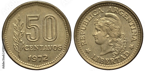 Argentina Argentinean coin 50 fifty centavos 1972, laurel spring left to value and date, Liberty head left flanked by stars,