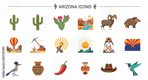 Arizona Icons Set featuring Desert Landscapes, Wildlife, and Cultural Symbols for Travel and Tourism