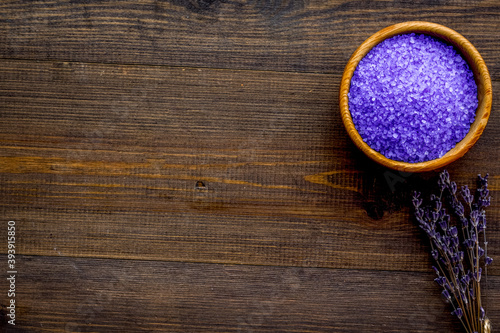 aroma therapy with lavender flower fragrance and spa salt on wooden background top view space for text