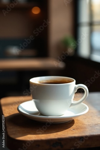 Aromatic Coffee in a White Cup on Wooden Table in Sunlit Cafe