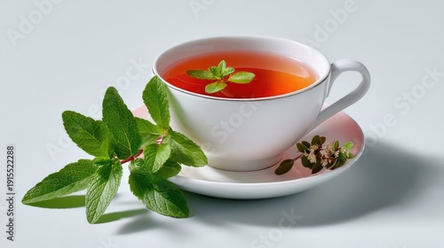 Aromatic Herb Tea Delight: A steaming cup of herbal tea is adorned with fresh leaves, exuding a comforting aroma. It promises a moment of tranquility and rejuvenation.