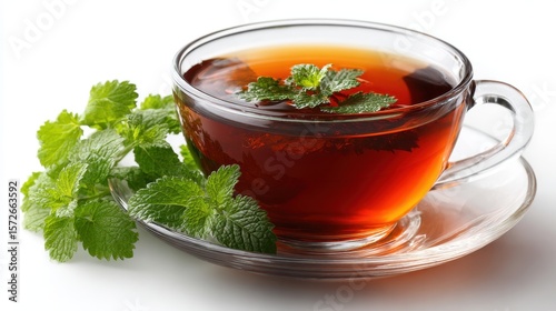 Aromatic Mint Tea in Clear Glass Cup with Fresh Mint Leaves on White Background