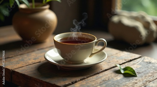 hot beverage, tea, cup, saucer, wooden table, rustic, plant, pot, steam, aroma, tranquil, peaceful, relaxing, comforting, warm, cosy, home, nature, leaf, still life, drink, morning