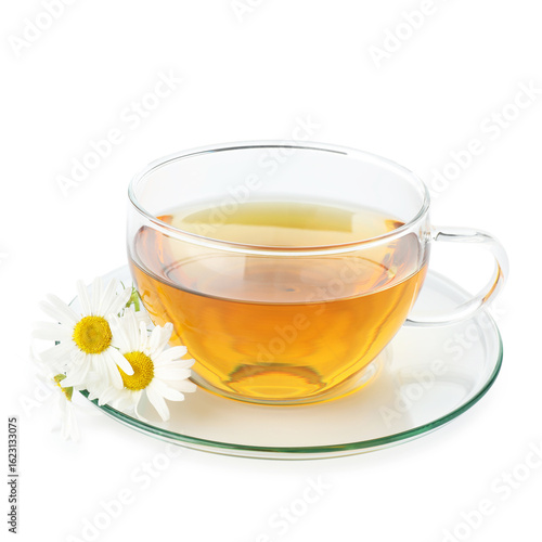 Aromatic tea in glass cup and chamomile flowers isolated on white