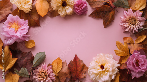 Arrangement of flowers and autumn leaves on a pink background creating a frame like border