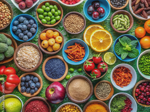 Array of vibrant superfoods in small bowls, surrounded by fresh fruits, nuts, and vegetables, against a solid colored background, promoting a nutritious and healthy lifestyle.