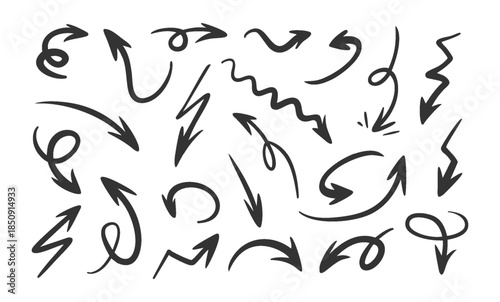Arrow Hand Drawn Set with Curved, Zigzag and Swirl Shapes. Black Ink Doodle Arrows, Directional Pointers for Collage Emphasis, Infographics Creative Design Expressive Accent. Vector Illustration