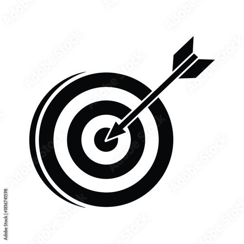 Arrow hitting the bullseye of a target, a black and white icon for success, isolated on