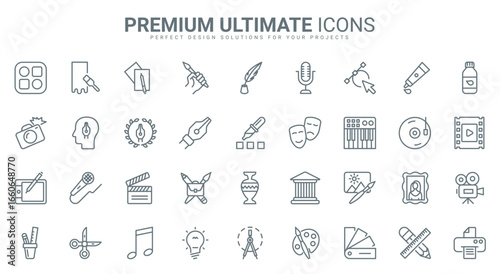 icon, line, creative, process, graphic, design, art, thin, web, idea, portfolio, theatre, theatre, concert, performing, clapper-board, mask, website, crayons, artwork, motion picture, music, cinema, video, paintbrush, production, outline, vector, editor, pictogram, bulb, photo, simple, camera, linear, set, flat, media, note, play, hobby, digital, symbol, signs, illustration, project, black, abstract, collection