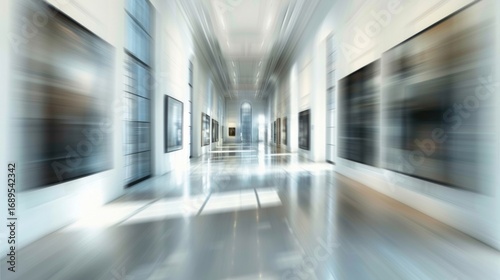 gallery, corridor, interior, art, museum, architecture, building, hall, space, design, white, light, modern, contemporary, exhibition, picture, painting, photograph, artwork, empty, perspective, motion, blur, smooth, isolated, wall, floor, clean, commercial, editorial, hospital, office, parking, underground, garage, room, hallway, glasses, tunnel, city, door, car, construction