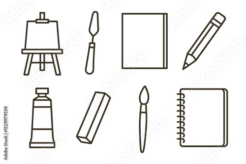 art, tool, line, icon, style, painting, drawing, easel, palette, knife, canvas, crayons, paint, tube, charcoal, stick, watercolor, brush, sketchbook, text, label, isolated, transparent, background