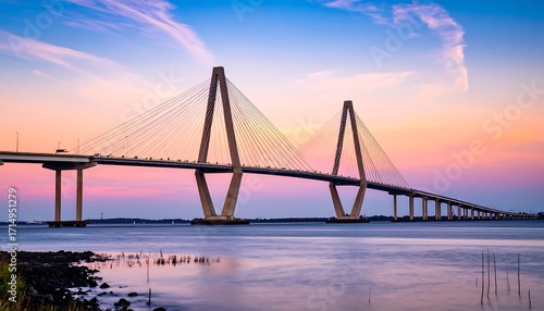 bridge, charleston, south carolina, sunset, sunrise, dusk, twilight, sky, cloud, pink, orange, purple, blue, water, river, architecture, engineering, transportation, travel, landscape, scenic, beautiful, picturesque, calm, peaceful, serenity, colours, vibrant, majestic, impressive, structure, design, construction, modern, contemporary, horizon, day, evening, light, shadow, calm water, coastal, ocean, sea, nature