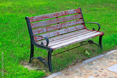chair, visitor, wood, iron, mottled, paint, ageing, rough, park, plant, grass, green, season, spring, summer
