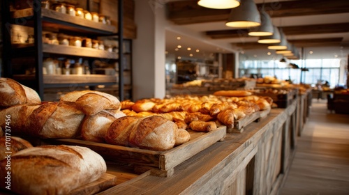 Artisan Bakery Display: Fresh Bread, Pastries, and Baked Goods on Rustic Wooden Counters in a Bright, Inviting Shop