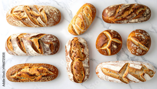 Artisan Bread Selection Variety of Crusty Loaves and Round Buns Overhead Shot