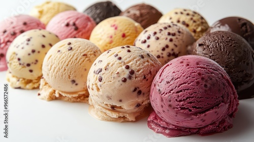 artisanal ice cream scoops in array of enticing flavors and colors creamy textures and delicate swirls showcase craftsmanship clean white background highlights frozen delights
