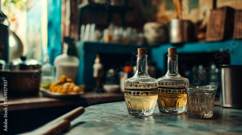Artisanal spirits and a cozy bar setting in a rustic kitchen