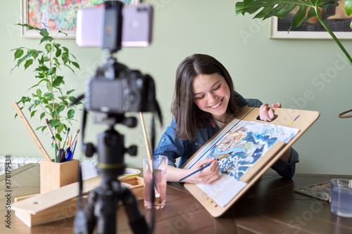 Artist, teenage girl, draws and records on video camera for his blog