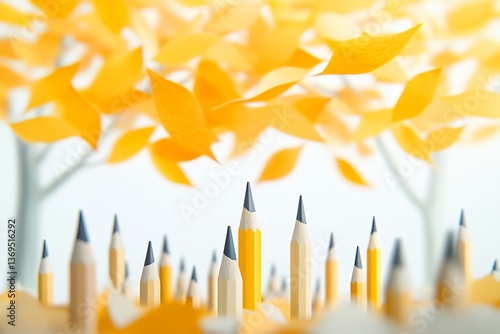 Artistic composition of pencils and abstract yellow leaves in soft focus