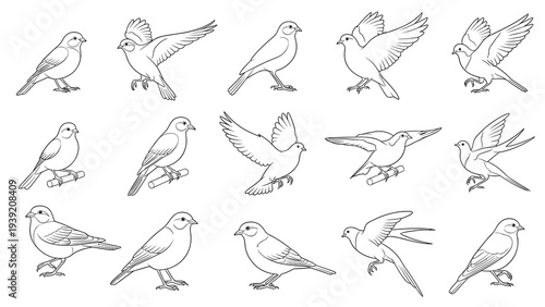 Artistic Outlines of Diverse Bird Poses: A Vector Collection for Designs, Coloring Pages, and Educational Resources, Showcasing Avian Anatomy and Graceful Movement in Line Art Style