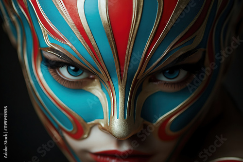 mask, portrait, art, colours, design, face, creativity, expression, detail, blue, red, eye, costume, performance, culture, make-up, character, festival, craftsmanship, fantasy, theatrical, decoration, inspiration, high-coloured, unique, beauty