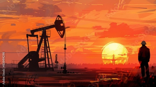 Artistic portrayal of a skilled engineer overseeing the oil pump as the sun sets in the background