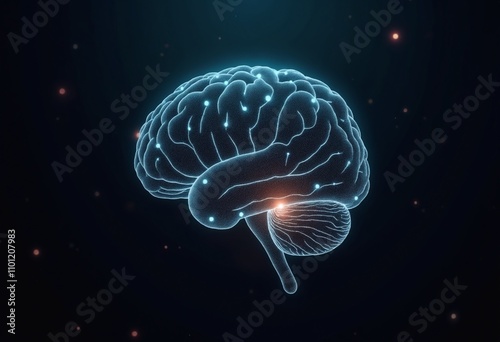Artistic rendering of a neural network as a floating, digital brain outlined with illuminated circuits