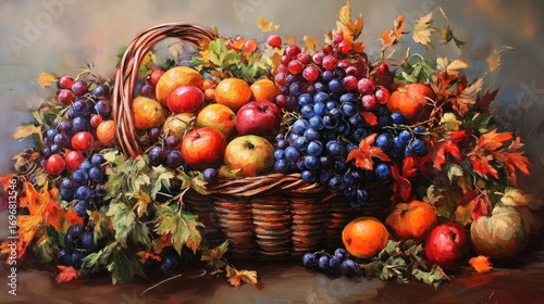 still, life, basket, fruit, grape, apple, autumn, harvest, painting, foliage, abundance, organic, rustic, fresh, vine, vinery, produce, ripened, natural, epicure, fruit farm, countryside, traditional, seasonal, colourful, healthy, culinary, vibrant, juicy, delicious, arrangement, artistic, composition, botanical, nourishment, vitamin, vegetarian, vegan, nature, flora, fall, thanksgiving