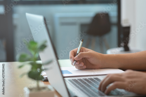 Asian business man use labtop and note job on paper in office.