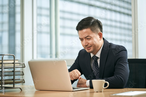 asian, chinese, man, business, working, office, businessman, korean, japanese, laptop, computer, notebook, happy, person, men at work, businessperson, looking, using, manager, ceo, china, people, businessperson, asia, east, corporate, executive, entrepreneur, white-collar, korea, japan, hong kong, singaporean, singapore, successful, success, satisfaction, satisfied, smiling, taiwanese, sitting, desk, suit, attaching, life, modern, male