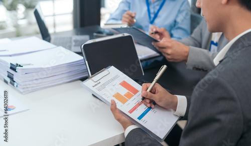Asian business people teamwork strategy corporate meeting in progress, brainstorming ideas, leadership decision-making executives in conference boardroom, productive people engaged in problem-solving