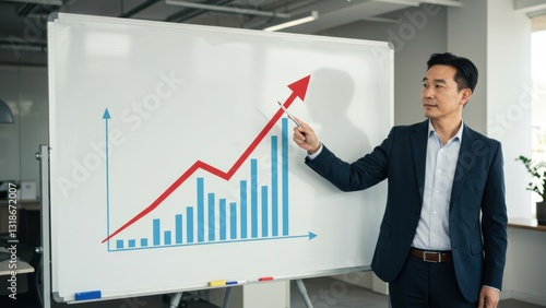 Asian businessman presenting growth chart in modern office Focus on corporate strategy and financial success concepts