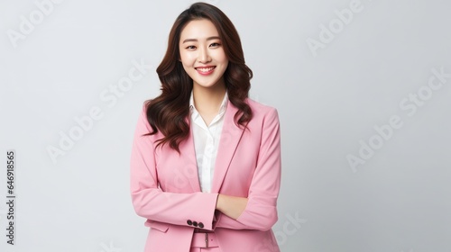 Asian businesswoman in suit on white studio background. generative ai