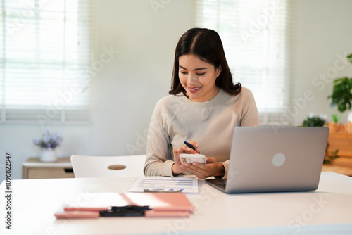 Asian Businesswoman Using laptop computer and working at office with calculator document on desk, doing planning analyzing the financial report, business plan investment, finance analysis concept.